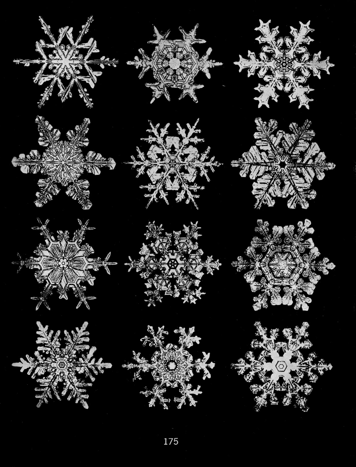 Starting from ten pages picked at random from Snow Crystals, consider how else this collection of individual photographs could be organized.Cut out the snowflakes, working with your hands and an X-acto knife. Using your eyes, arrange a subset of thirty snowflakes in one-dimension (as a line). This should be based on a particular criterion. For example, most hexagonal to least hexagonal. Find a large enough space to try this several ways and choose one you are happy with. It must be visual! Tape the snowflakes in place.
